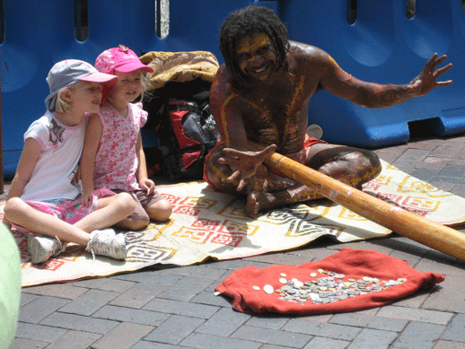 A didgeridoo player entertaining tourists and commuters at the busy