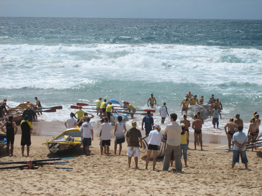 Some lifeguards going out to the ocean to do some rowing at Bondi